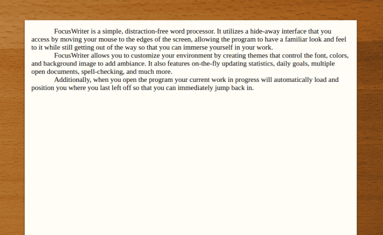 FocusWriter is an application that aims to eliminate any distractions that a writer may have. While creating a blog post, an author may use a variety of resources stored on the desktop as well as in the browser. Focusing on one idea and sticking to it is hard. FocusWriter suggests simple, yet genius method of writing. You have only a document in front of you, no disturbances.