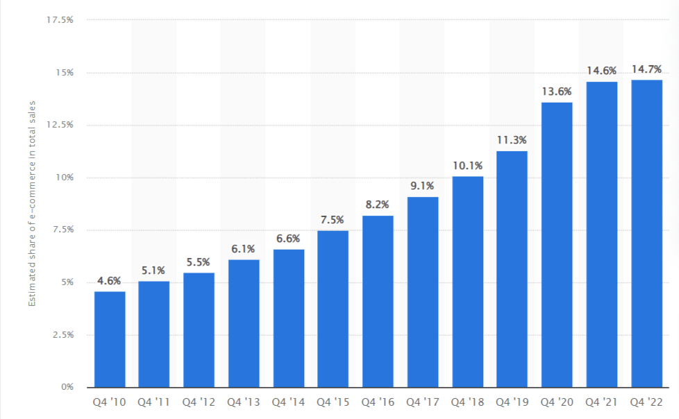 According to Statista, during the last quarter of 2022, e-commerce accounted for 14.7% of total U.S. retail sales, marking a significant increase from 2021 when e-commerce sales constituted 12.9 percent of total retail sales during the holiday quarter, more than doubling within that year.