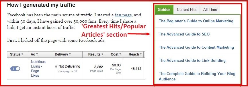 > Add a ‘Popular Articles/Greatest Hits’ section, like QuickSprout Blog does.